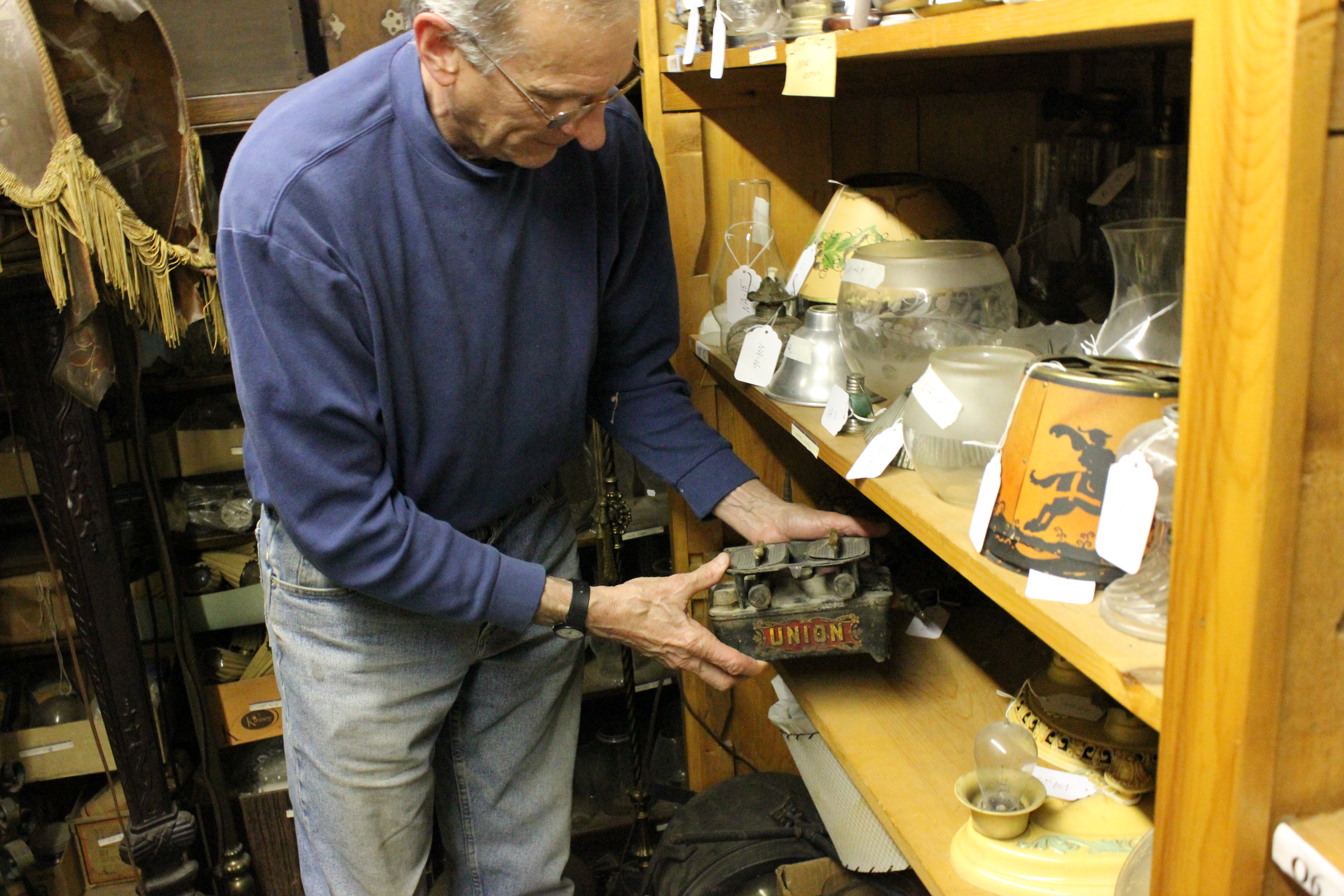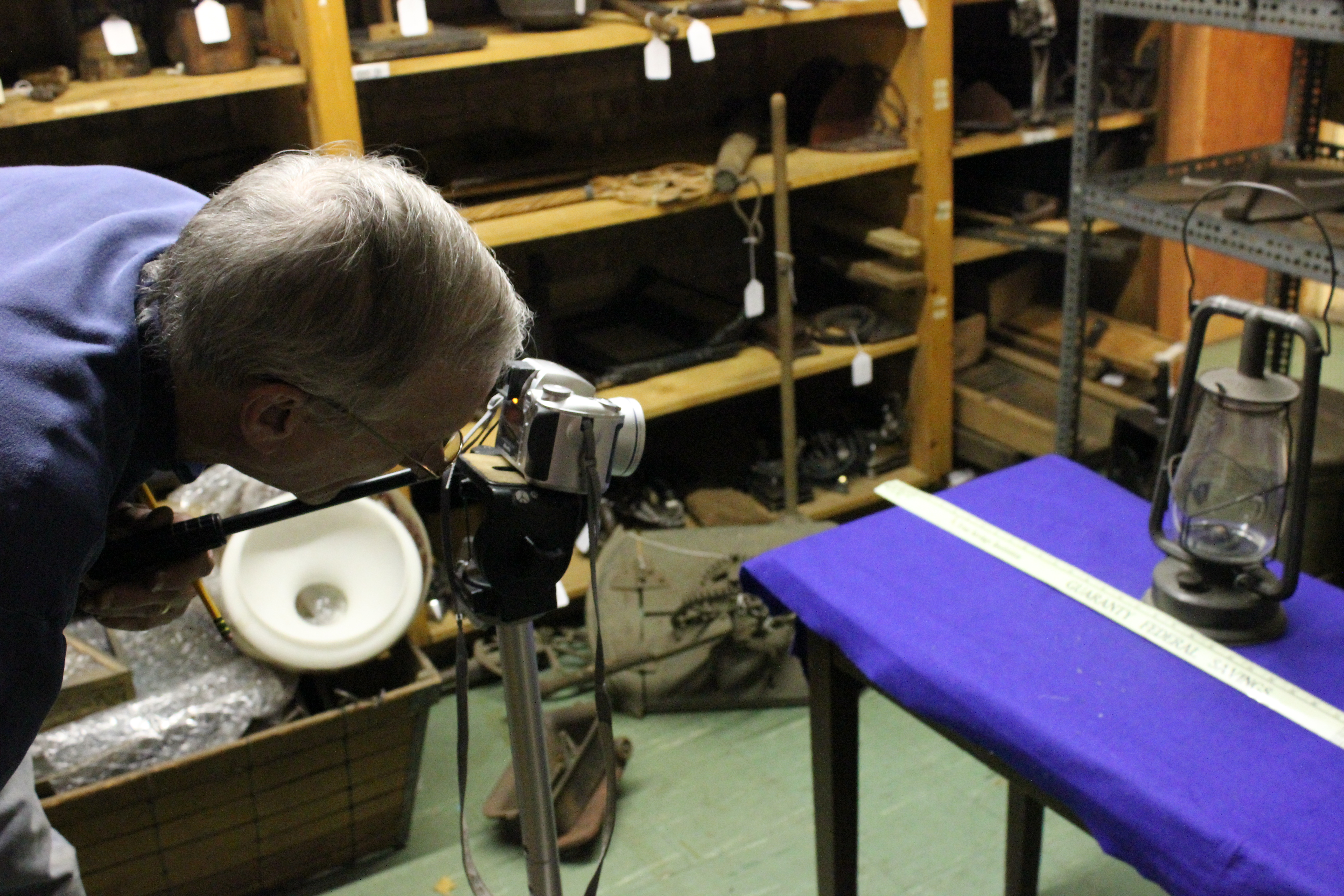 First, a member of our staff or a volunteer (pictured here is Tom Saroglia, one of our regular volunteers) takes an un-inventoried artifact and looks for any identifying numbers, called accession numbers. An accession number shows the year an artifact was donated and which part it was of a specific donation. If an accession number can’t be found, we give the artifact an “NA” number or un-accession number. This allows us to keep track of which artifacts we need to look at again or research. This is also the time when staff can determine if we have too many of a certain artifact– more than three of a clothes iron is two too many that we can’t use!