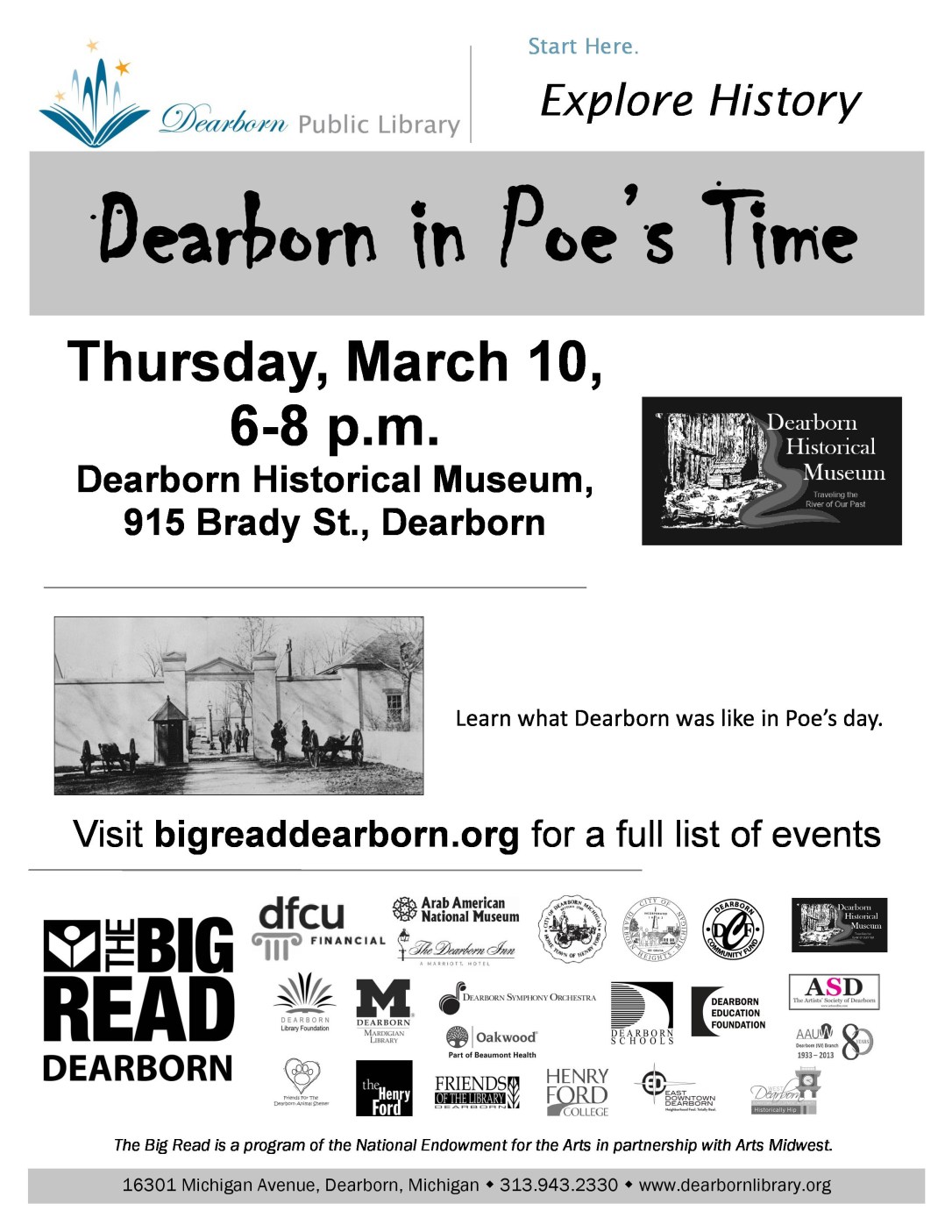 Join us for a very special presentation on Thursday March 10th from 6 to 8 p.m. at the Dearborn Historical Museum at 915 Brady Street. You will find out what the Dearborn area was like in the time of Edgar Allen Poe. If you have questions, please call the Museum at 313-595-3900