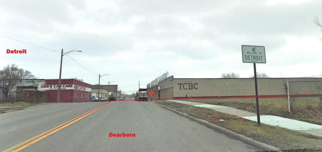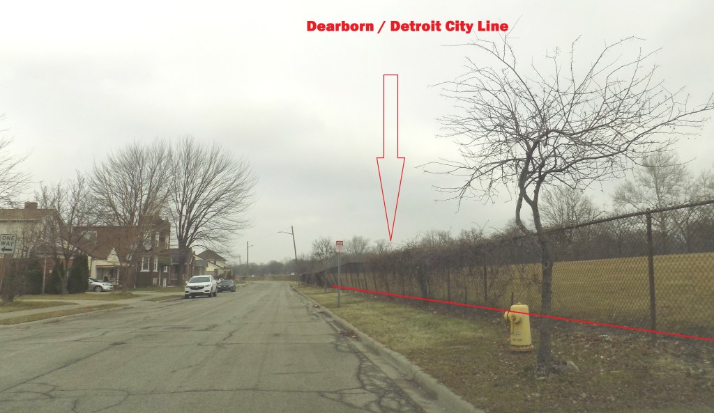 The northeastern section of Dearborn’s border is based upon the Detroit Terminal Railroad which was completed across the Detroit area as far as the Michigan Central Railroad in modern Dearborn in 1914. Officially from where Wyoming crosses the railroad to Tireman, Dearborn’s border lies 100 feet east of the western edge of that railroad’s right of way.