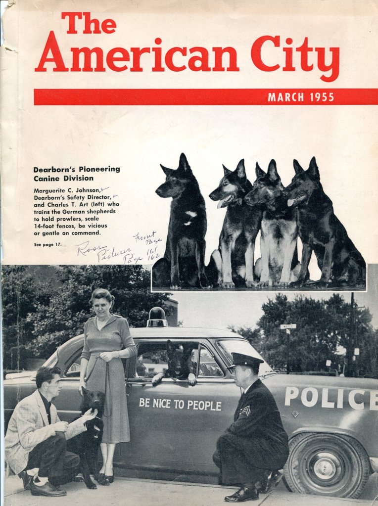 During 1955, Dearborn became one of the first cities in the US to acquire dogs for use by its police department. While the program was popular, the initial experiment lasted only 10 months as it was deemed Dearborn didn’t have enough use for the dogs. The four dogs acquired by Dearborn were later sold to Portland Oregon.