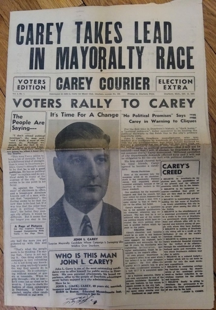 John Carey, an aeronautical engineer, won the 1935 mayoral election against Clyde Ford and was the second Mayor to preside over consolidated Dearborn. Due to increased manufacturing at the Rouge plant, Dearborn’s economy strengthened during his time in office.