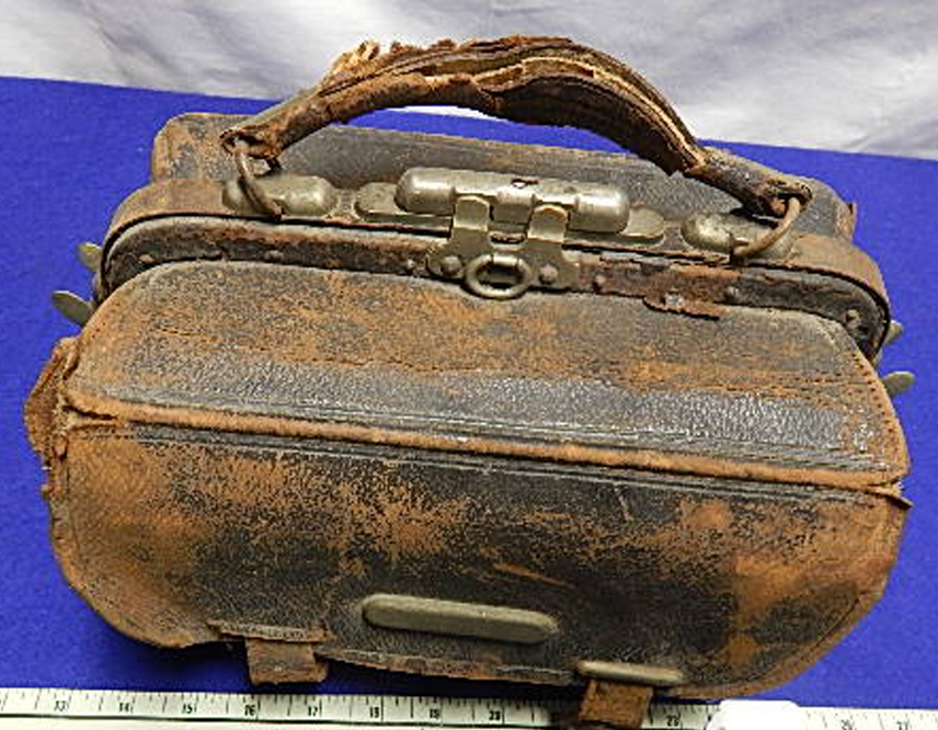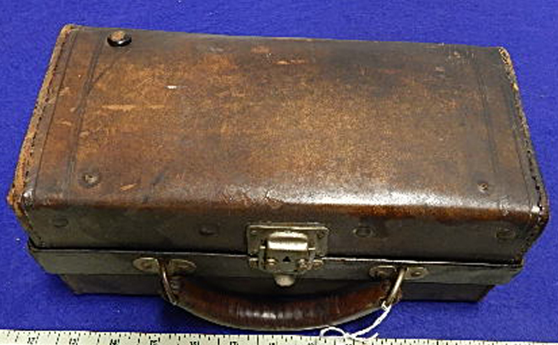 This brown leather case from Dearborn contains bottles of medicine from Parke, Davis & Company and tablets in tiny corked bottles. Parke, Davis and Co. was founded in 1860 in Detroit by Dr. Samuel P. Duffield and was once the world’s largest pharmaceutical company. c. 1920s