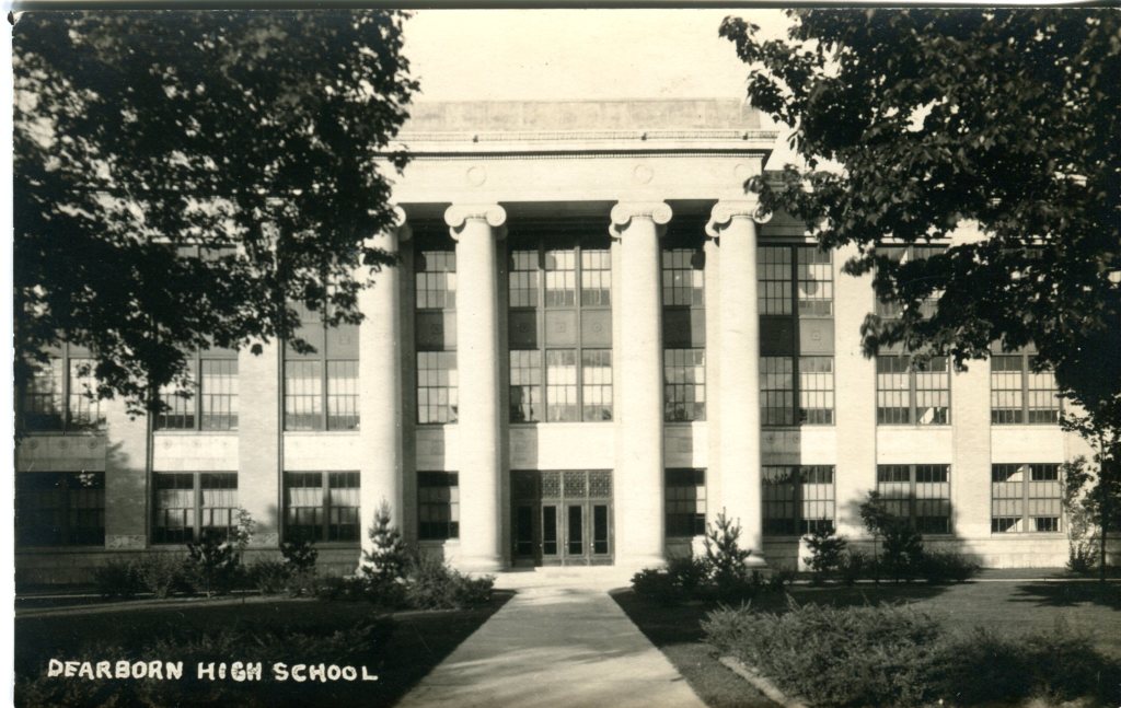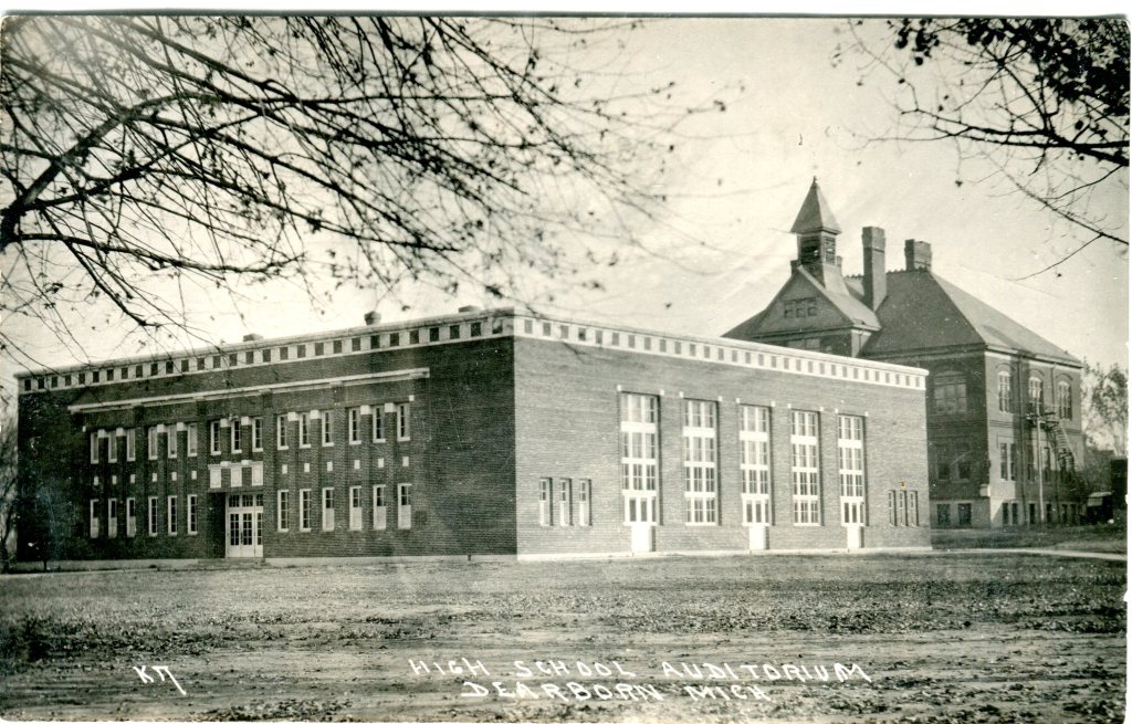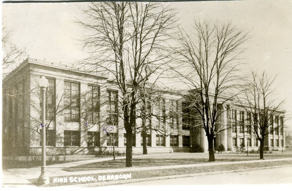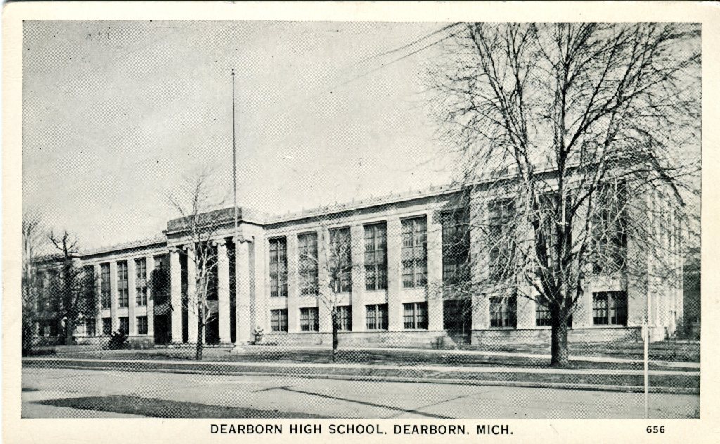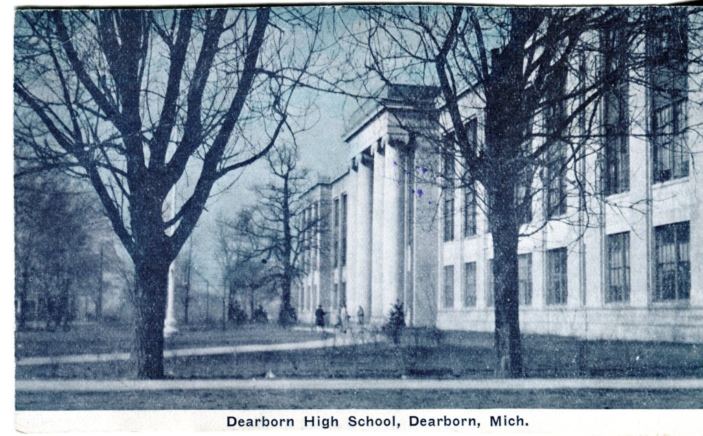 Postcards of the second Dearborn High School building which opened in 1926. After the third Dearborn High School opened on Outer Drive, this building on Mason north of Garrison became Ray Adams Junior High School. The structure survives as the Atrium Office Complex.