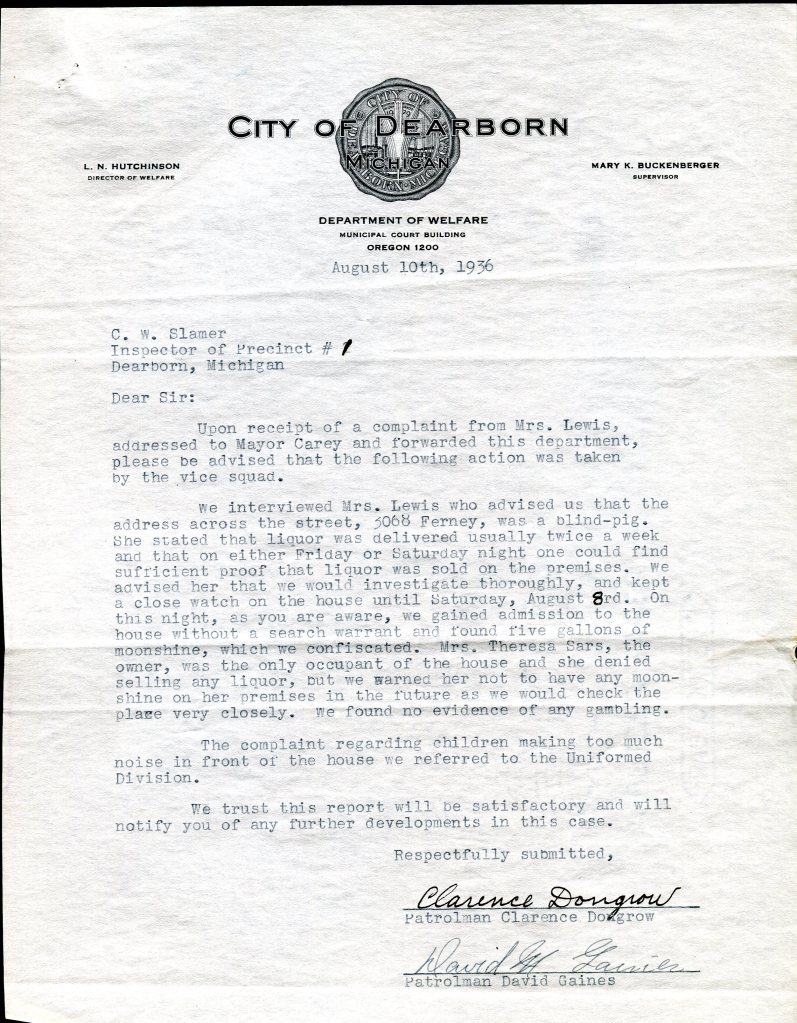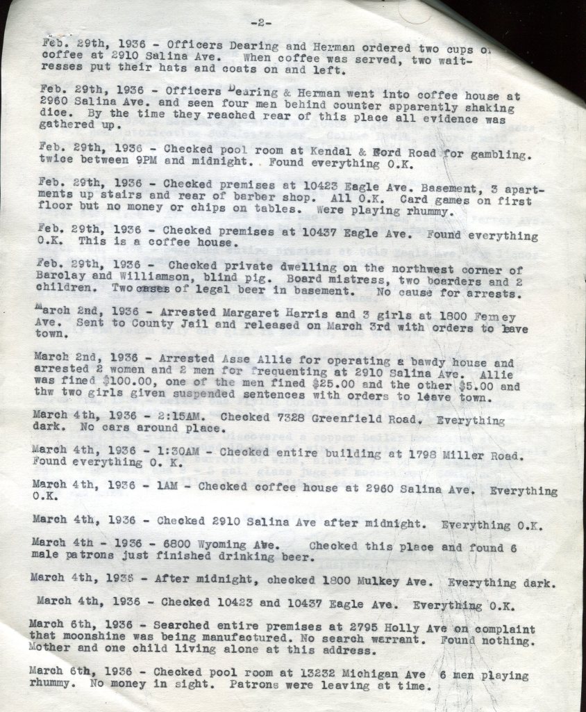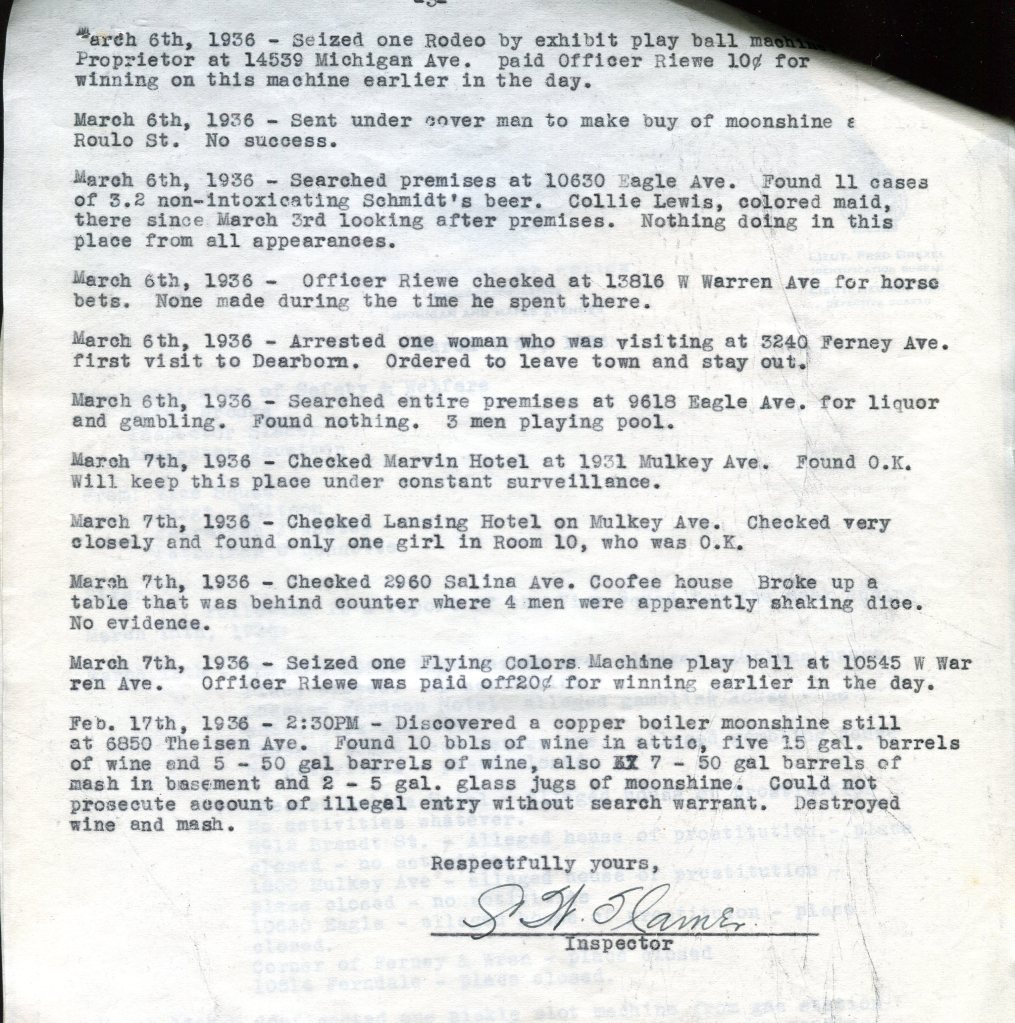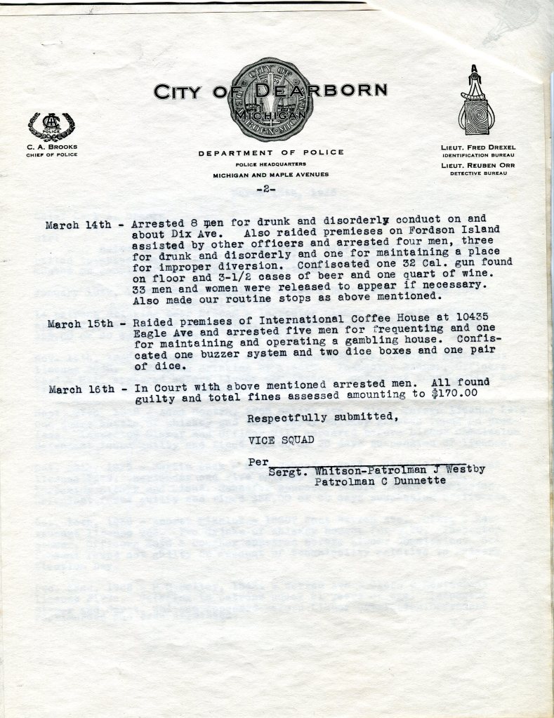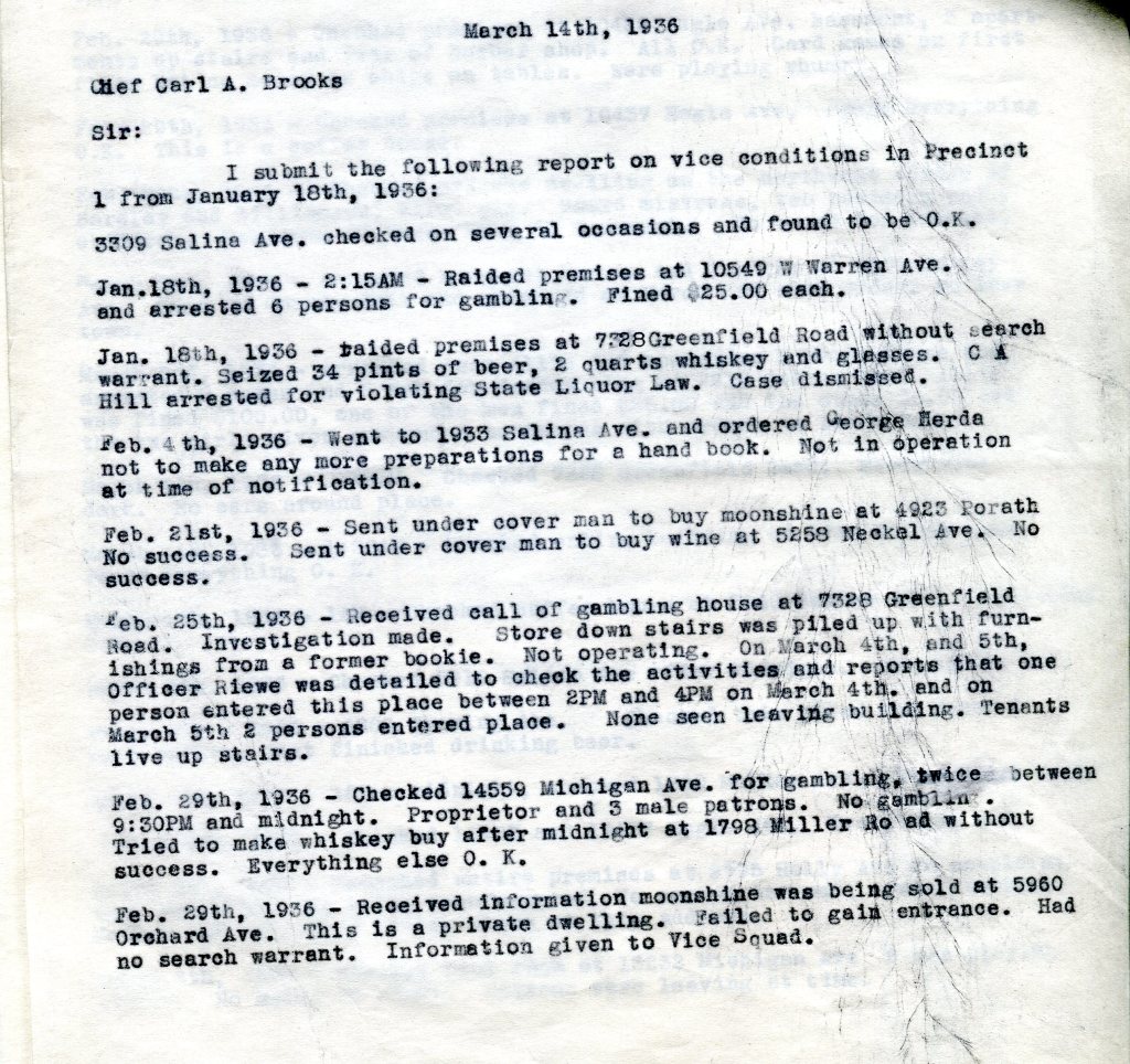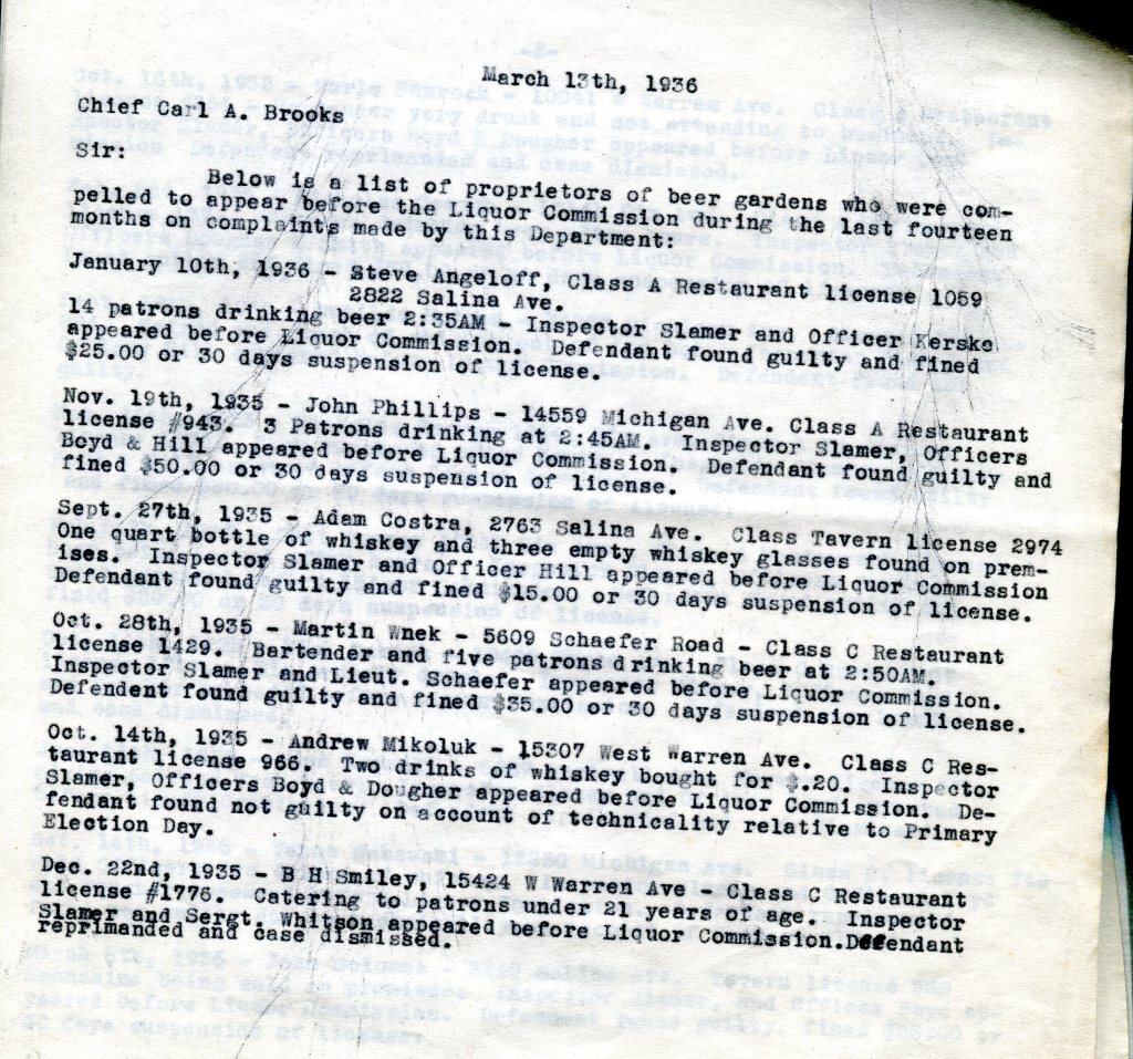 Report of Dearborn Police Vice Squad For The Week Ending March 15th 1936.List of Dearborn beer garden proprietors who were compelled to appear before the Liquor Commission during the last fourteen months on complaints made by the Dearborn Police Department (March 13th 1936 document)Report On Vice Conditions In Dearborn Police Precinct 1 From January 18th 1936 Through March 14th 1936.Letter originally sent to Councilman Clarence Doyle about conditions in the Dix Avenue area.