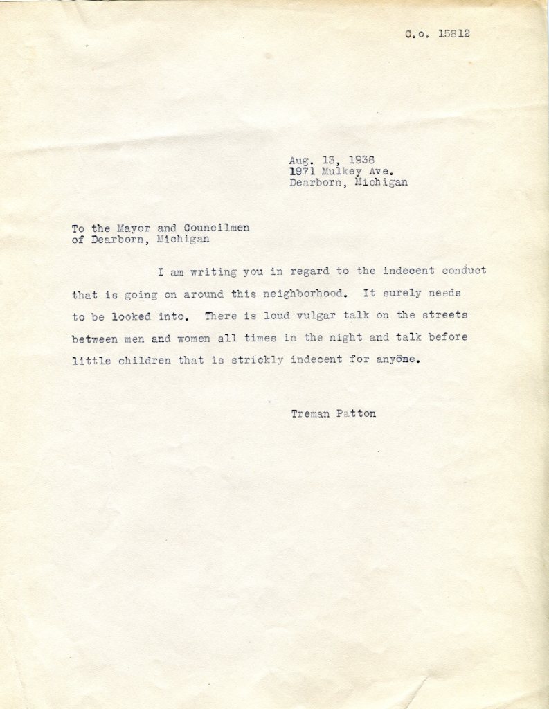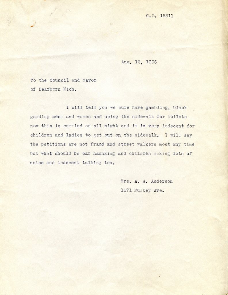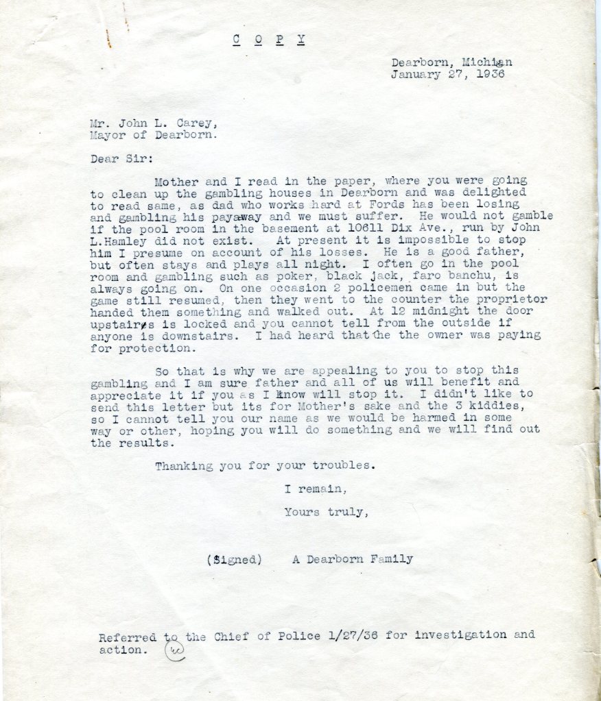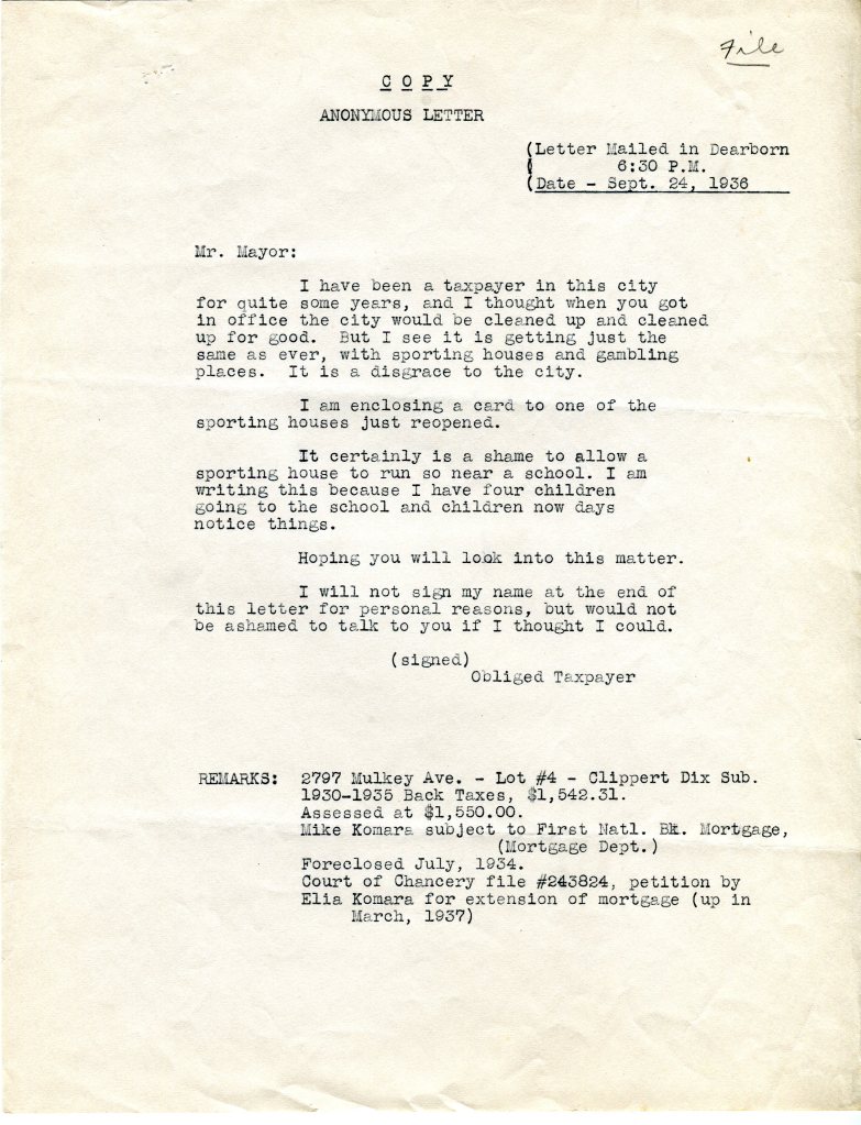 Letter and memo discussing a gambling house at 10419 Eagle Street.Letter complaining about drunken behavior on Mulkey Avenue that was forwarded to the police and a response from the Dearborn Police.Letter by Mrs Theodore Perva accusing her neighbors of running a blind pig (speakeasy) and a letter from the Dearborn Police about an investigationComplaint letter from 1571 MulkeyComplaint letter from 1971 MulkeyLetter by Mrs. A. A. Anderson complaining of a blind pig (speakeasy) across from 3205 Ferney and its owner bribing kids with candy to harass neighbors. Also attached is a letter regarding a police investigation of the complaint.Handwritten and typed copy of a letter originally sent to Police Chief Carl Brooks that suggests the need for a “whore house” in the Southend.Complaint about gambling house at 2797 Mulkey.Memo sent to the Police Department about complaints that the Salina Hotel is operating a brothel along with a letter from the police about their investigation of the place.Complaint letter sent by Southend residentList of troublesome locations sent to either the mayor or Dearborn PoliceComplaint letter about specific gambling houses and brothels in the Southend.Complaint letter about a gambling hall at 10611 Dix.1941 indictment for Dearborn Police Chief Carl Brooks and 12 others for alleged conspiracy in the operation of vice houses and gambling resorts.