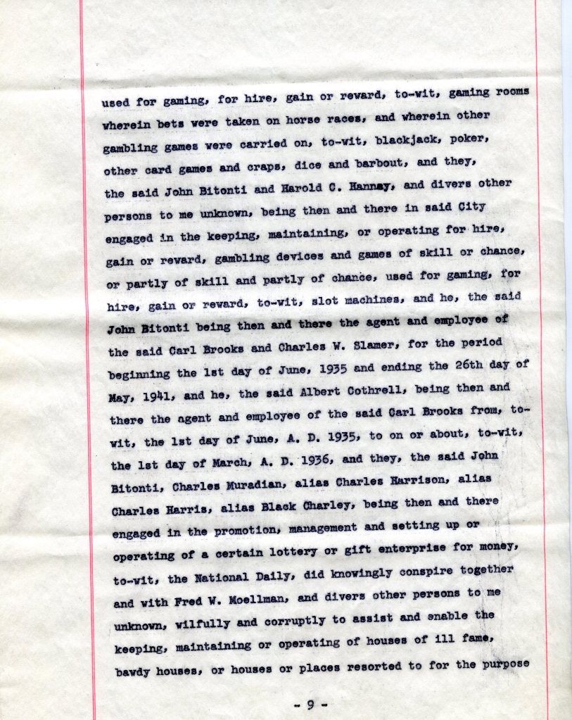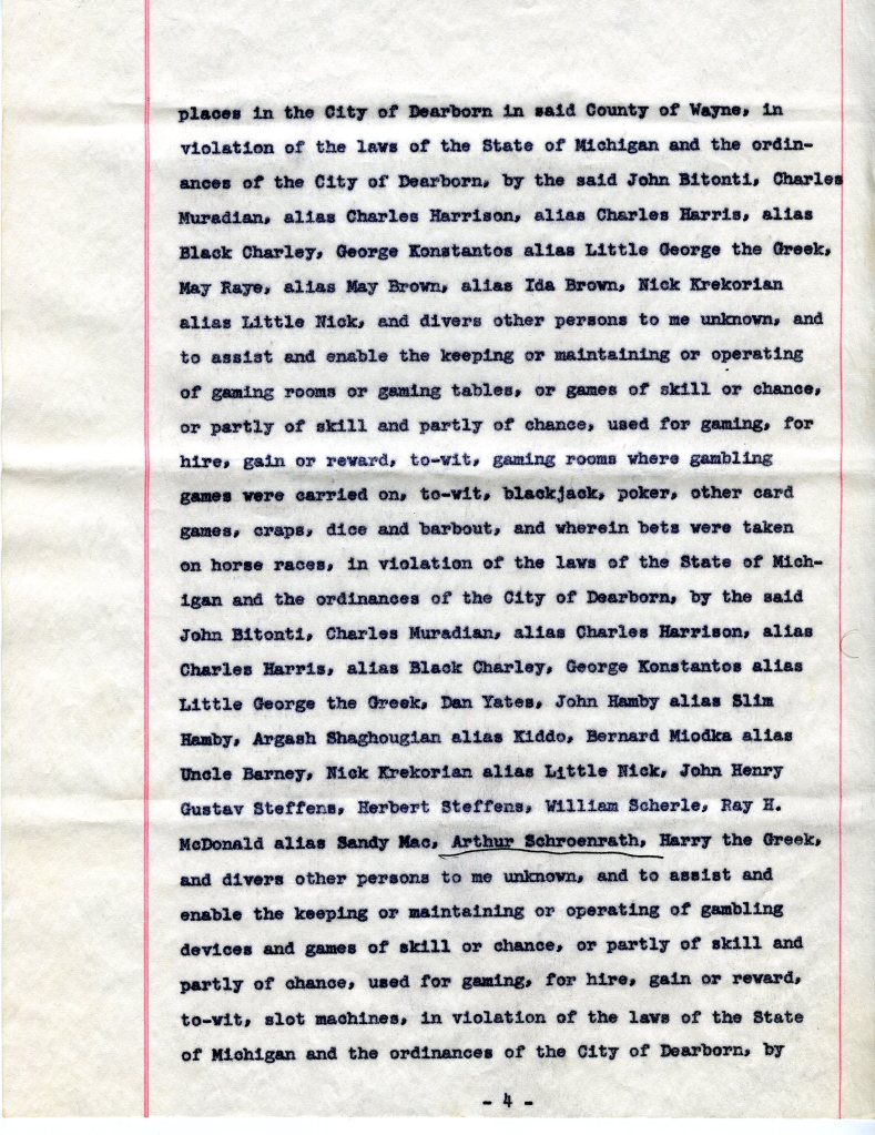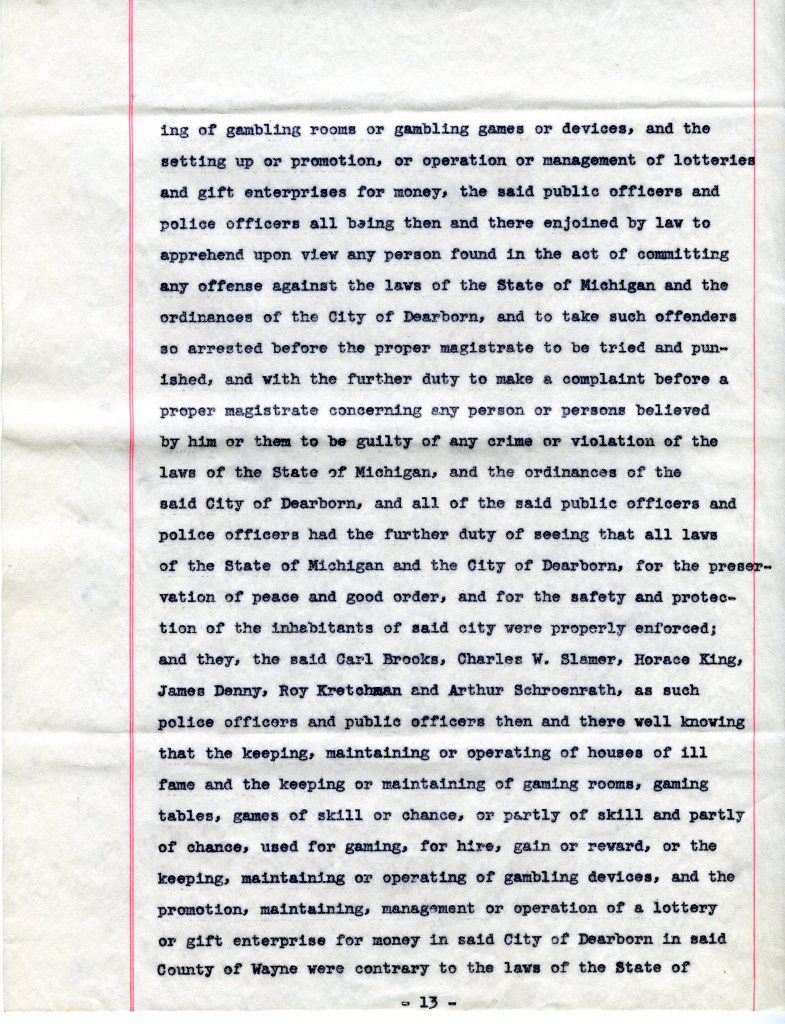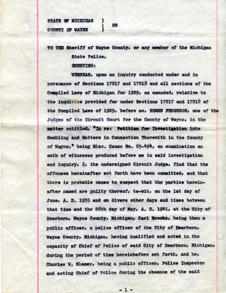 Letter and memo discussing a gambling house at 10419 Eagle Street.Letter complaining about drunken behavior on Mulkey Avenue that was forwarded to the police and a response from the Dearborn Police.Letter by Mrs Theodore Perva accusing her neighbors of running a blind pig (speakeasy) and a letter from the Dearborn Police about an investigationComplaint letter from 1571 MulkeyComplaint letter from 1971 MulkeyLetter by Mrs. A. A. Anderson complaining of a blind pig (speakeasy) across from 3205 Ferney and its owner bribing kids with candy to harass neighbors. Also attached is a letter regarding a police investigation of the complaint.Handwritten and typed copy of a letter originally sent to Police Chief Carl Brooks that suggests the need for a “whore house” in the Southend.Complaint about gambling house at 2797 Mulkey.Memo sent to the Police Department about complaints that the Salina Hotel is operating a brothel along with a letter from the police about their investigation of the place.Complaint letter sent by Southend residentList of troublesome locations sent to either the mayor or Dearborn PoliceComplaint letter about specific gambling houses and brothels in the Southend.Complaint letter about a gambling hall at 10611 Dix.1941 indictment for Dearborn Police Chief Carl Brooks and 12 others for alleged conspiracy in the operation of vice houses and gambling resorts.