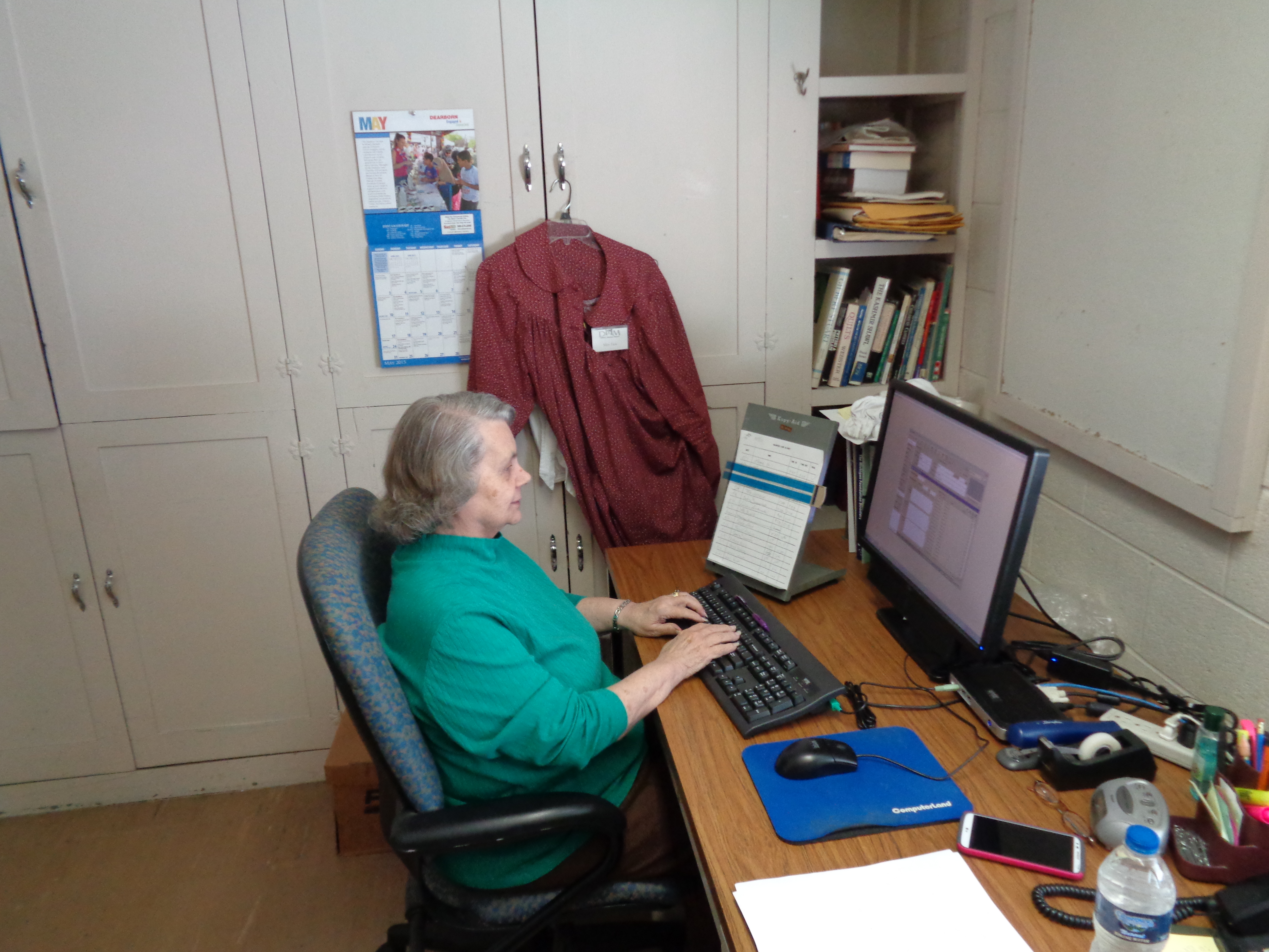 A: Oh my gosh. I started out working with little Karen Krepps. I call her little Karen, because we had blonde Karen and little Karen. I started with her going through archive boxes from the 30’s. They were thinning them out, and going through pictures and things like that. I started out working with her, and I was probably over there close to a year. Then, we always came over here (to the office) and signed in. I don’t know how I got talking to Marguerite, and she said something about the computers. I said, “Yeah I’ve worked with computers all the way from card machines right up through. She said, “Would you like to come here” and I said, “Well yeah.” So, it has probably been about a year and a half I’ve been here (in the office).